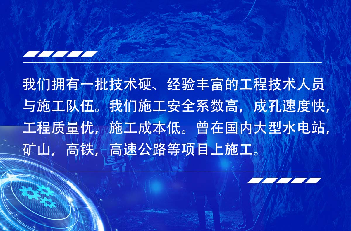淮北市勤拓礦山工程有限公司是一家從事多年反井鉆機(jī)施工的服務(wù)生產(chǎn)型公司,公司目前有十幾臺(tái)鉆機(jī)設(shè)備,ZFY120/30/150型反井(天井)鉆機(jī)5臺(tái),ZFY1.8/40/250型反井(天井)鉆機(jī)4臺(tái),ZFY2.5/70/200型反井(天井)鉆機(jī)2臺(tái),ZFY3.0/120/400型反井鉆機(jī)1臺(tái),ZFY3.5/120/400型反井(天井)鉆機(jī)1臺(tái),可承接深度0-300米,成孔直,0.9~4米.1.2~3米的各種豎井、井下煤倉、溜煤眼、通風(fēng)井、調(diào)壓井、電纜井、泄水井等。我們擁有一批技術(shù)硬、經(jīng)驗(yàn)豐富的工程技術(shù)人員與施工隊(duì)伍。我們施工安全系數(shù)高,成孔速度快,工程質(zhì)量優(yōu),施工成本低。曾在國內(nèi)大型水電站,礦山,高鐵,高速公路等項(xiàng)目上施工。